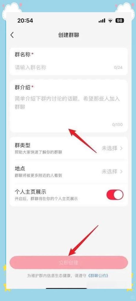 进入创建群聊页面后,需依次输入群名称、群介绍、选定群类型,并选择是否在个人主页展示该群。完成上述步骤后,点击“立即创建”按钮即可。