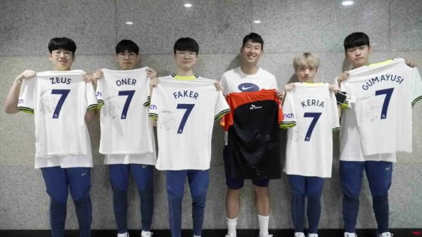 T1部队举起了签名的热刺球衣,其名字印在足球运动员的电话号码上方。作为回报,桑尼(Sonny)拥有自己的红色和黑色T1球衣,由LCK团队签下。