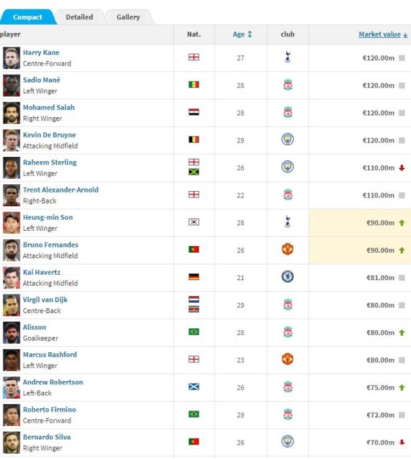 在英超的所有球员里,身价最高的一共有4位,分别是热刺的哈里-凯恩、利物浦的萨拉赫、利物浦的马内和曼城的德布劳内,这4位巨星的身价都是1.2亿欧元,再往后数是曼城的斯特林,他的身价是1.1亿欧元,阿诺德身价同样是1.1亿欧元,而孙兴慜的身价是9000万欧元,排名英超第7位。