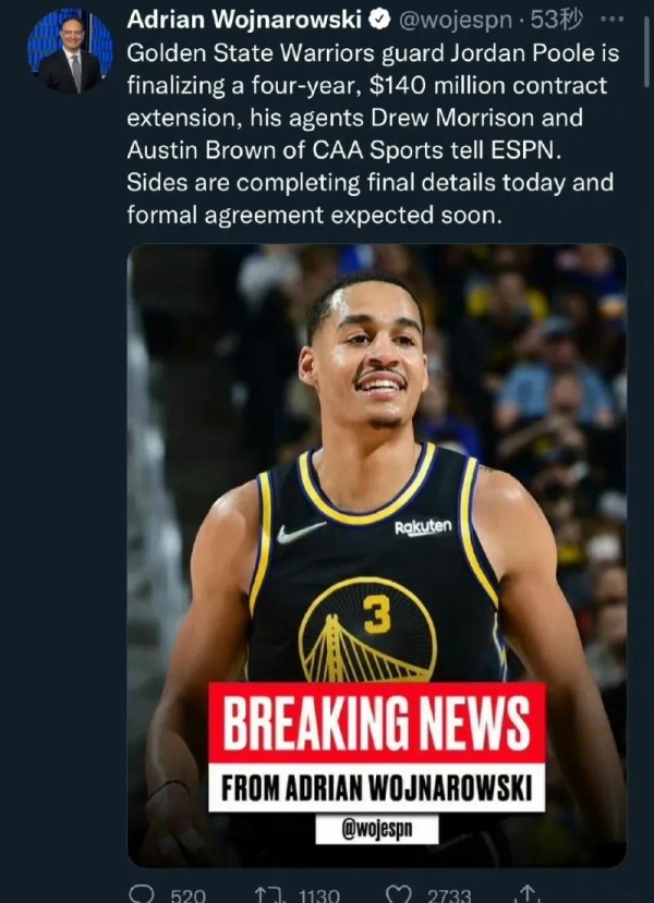据Woj报道,乔丹普尔和勇士队正敲定一份4年1.4亿美元的提前续约合同,双方目前正在完成最终细节,预计很快达成正式协议。
