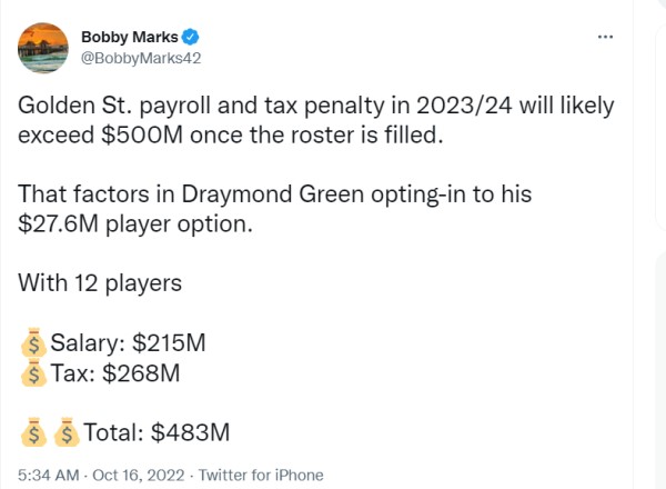 薪资专家Bobby Marks跟进报道称,若德拉蒙德格林选择执行23-24赛季2760万的球员选项的话, 勇士12名球员23-24赛季薪资总额将达到2.15亿,奢侈税将达到2.68亿,总计4.83亿。