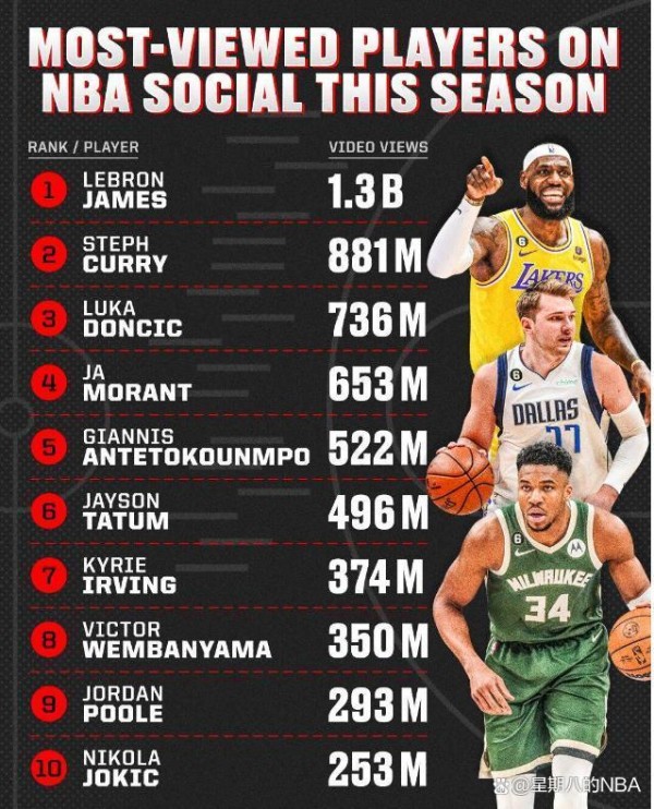 在社交平台播放量榜单中,詹姆斯遥遥领先,库里紧随其后,令人惊讶的是普尔居然第9名,超过了NBA一众球星,连MVP约基奇都不如普尔。