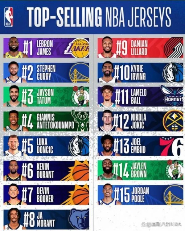 另外球衣销量榜单中,依然是詹姆斯和库里前二,普尔也能排名联盟第15名。联盟400多号人能排名前15,依然了不起,排在其后的大牌如浓眉,哈登,小卡,乔治,汤普森,唐斯,米切尔等等太多了。