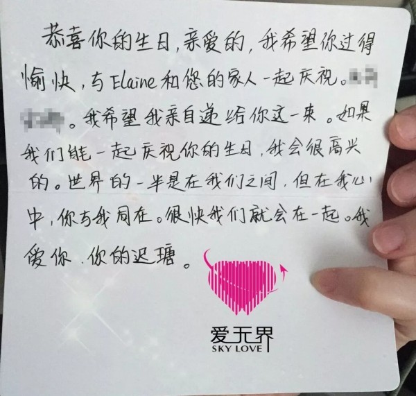 迟女士也给男士取了一个中国名字“迟瑭”,是她的姓以及她妈妈姓的组合,非常有意义。男士中文也不错,在女士生日那天为女士送来了礼物,还写了一封信。