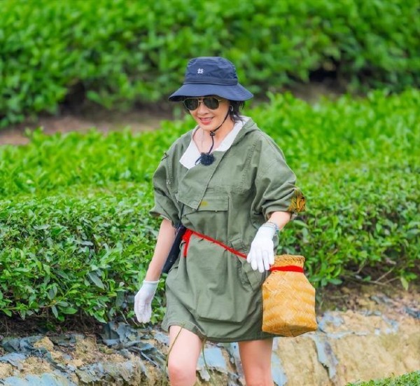 最新的一组街拍,是她复古大衣加牛仔裤,高筒靴踩街吃鸡蛋仔,就差手提袋写满英文字母走秀了。这类照片底色浓烈,把生活气息拉满,很难想象这是个五十岁以上的人日常状态。但事实确实如此,无论是采茶还是旅游,都活力十足,看起来比一些年轻艺人还拼呢。