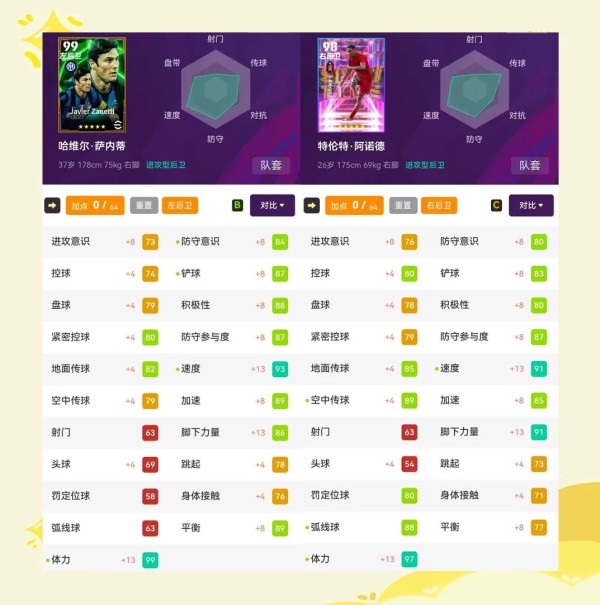 萨内蒂拥有出色的对抗能力和速度,既能防守又能及时插上进攻。他以勤勉的工作态度和全面的足球技能闻名,不仅在防守端表现出色,更在进攻端展现出威胁性。尤其是在边路的快速插上和迅速回追能力,使他成为了攻防兼备的边后卫。他的速度属性带来了战术上的灵活性,而他的全能性和战术适应性则让他成为球队中不可或缺的一员。