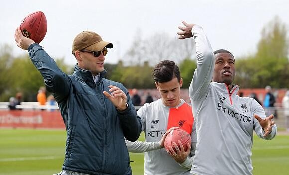 两名NFL明星科尔克·考辛斯和哈维斯·兰德里在本周开启英国行,利物浦成为其中重要一站。除了参观了“披头士博物馆”,考辛斯和兰德里还前往梅尔伍德基地一探究竟,在训练场上,他们还与库蒂尼奥和维纳尔杜姆互动,手把手地教授他们投掷橄榄球的技巧。
