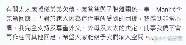 作为卢国辉的女儿、李克勤的妻子,卢淑仪随后的回应更让人心疼。她在发声中直言,弟弟卢煜培的债务问题早已成为家庭的“噩梦”,看着年迈的父亲晚年还要为儿子的债务奔波煎熬,自己满心都是痛心。“这些年,全家没有一刻停下过帮他的脚步,能拿的钱都拿了,能想的办法都想了,几乎倾尽所有,可债务就像个无底洞,怎么填都填不满。”卢淑仪的话里满是无奈,她表示这个断绝关系的决定,是和家人反复商议后才做出的艰难选择,同时也恳请外界能体谅家人的难处,不要再打扰年迈的父母,此后不会再对此事过多回应。