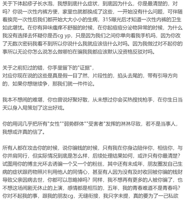 孟子坤还表示自己没有出轨和性病,女友染病是因为穿了一次性内裤,“她抛出的问题不让她提供确凿证据,让我自证”“这种事根本没法自证,也没有摄像头也没有上帝视角,我没有选择沉默,但除了一条条被动的回应我真的不知道该怎么证明”。