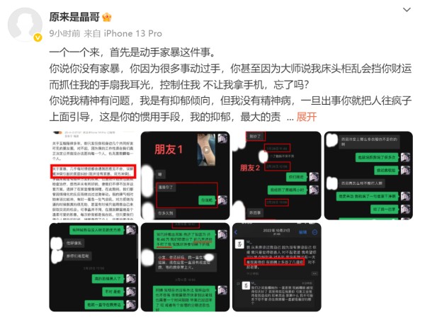 随后,李晶在其社交账号连发两条微博回应,“我有过伤害自己的行为。但是是因为在我们长期的相处中,一旦有冲突,他就辱骂我,辱骂我全家,对我进行精神攻击,我和他体型相差巨大,我无力反击,只能通过伤害自己的行为让他停下。”