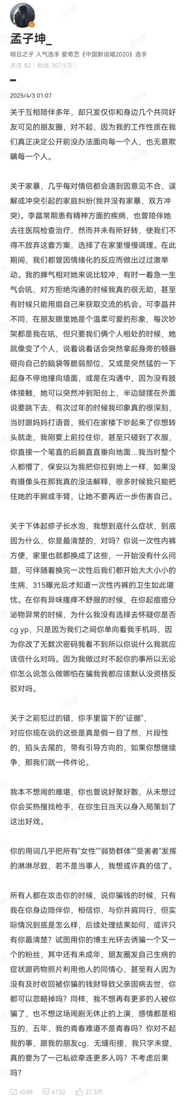 孟子坤回应前女友万字长文:家暴出轨均为不实
