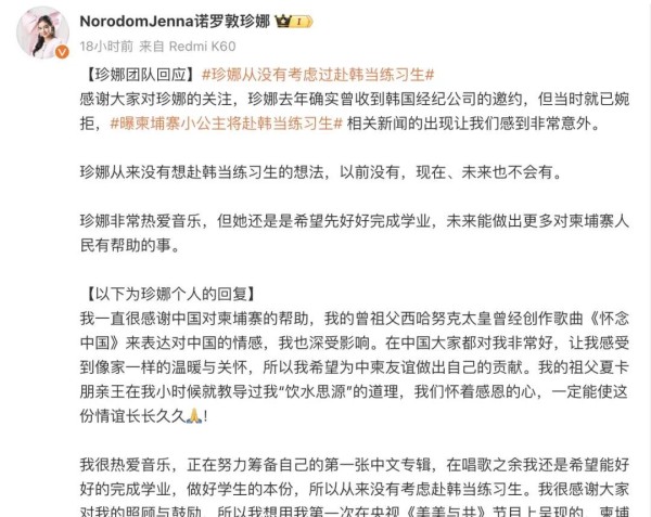 柬埔寨王室公主被曝受邀赴韩当练习生?本人回应:已婉拒