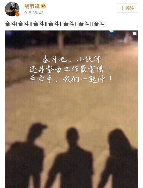 胡彦斌在薛之谦发微博图片表示复婚后,用薛之谦与前妻复合的图片改了一张三人行版本,还配文努力工作,怼薛之谦的意味相当明显。