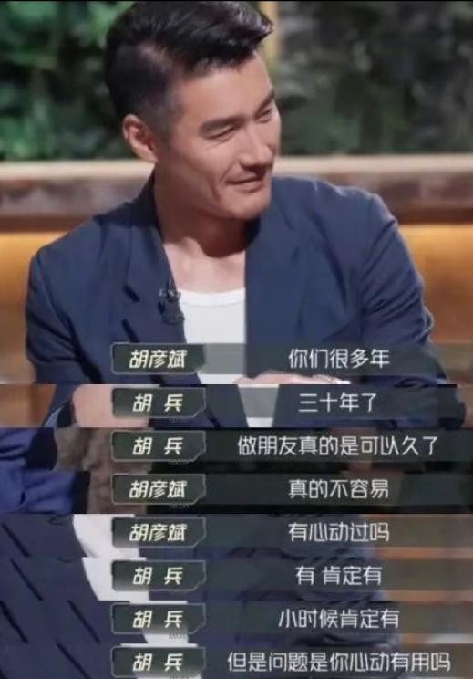 接着胡彦斌抛出大杀招,主动问胡兵和瞿颖合作那么多年,有没有心动过。想必胡兵也是被这个问题问住了,不过胡兵老师毕竟出道三十多年,所以很快反应过来。胡兵说小时候的确心动过,不过胡兵马上来了一招反问:你心动有用吗?
