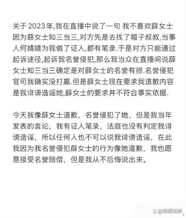 后来薛小婉起诉韩安冉侵犯名誉权,最终胜诉,韩安冉按判决道歉。但这道歉却引发新争议。韩安冉承认侵犯名誉权,愿担责,可又坚称没造谣,仍坚持对薛小婉的指责。这种态度让网友不满,大家觉得她既已败诉,道歉就该诚恳,而非还为自己辩解。网友们对这次道歉看法不一。有人觉得韩安冉能公开道歉,是和解的第一步,在网红圈低头不易,值得肯定。也有人认为她是迫于法律压力,并非真心悔过,这场恩怨恐怕还没结束。还有人看累了争吵,只希望两人能放下矛盾,别再闹了。