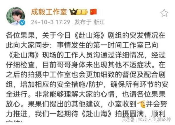 10月3日,国庆假期,本该是阖家团圆、欢乐祥和的日子,然而娱乐圈却突发意外,知名演员成毅在上海某影视基地拍摄新剧《赴山海》时发生意外,从高空威亚坠落,重重摔在坚硬的台阶上,这一消息迅速在网络上发酵,引发了粉丝和媒体的强烈关注。