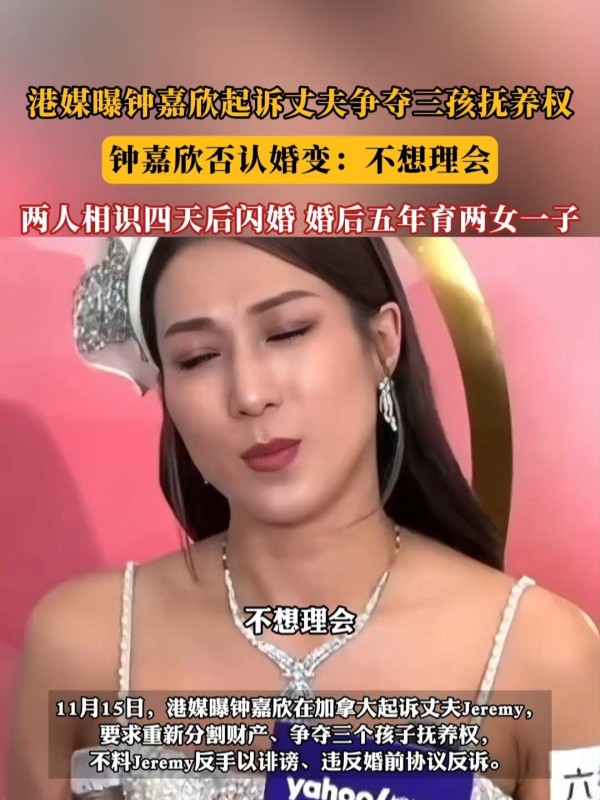 港媒曝钟嘉欣在加拿大起诉丈夫 离婚诉讼引发关注钟嘉欣起诉外国丈夫,三胎妈妈复出争抚养权,婚姻变局引发网友热议