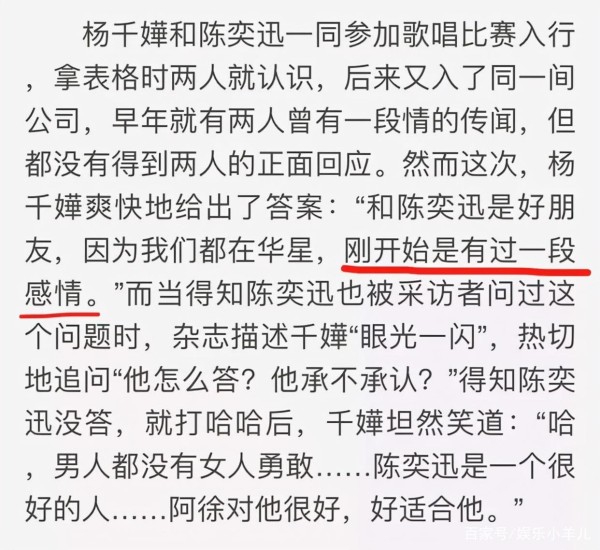 2011年,杨千嬅多次承认和陈奕迅有过一段恋情并表示:“当时更像是超越了朋友的那种,如同高中生懵懵懂懂的爱。”但是记者问起陈奕迅时,却并没有得到回应。杨千嬅得知后还说:“男人都没有女人勇敢。”