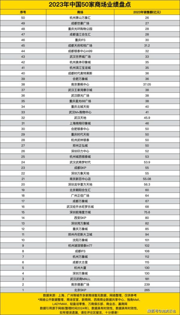 上海、广州等城市多家商场暂无数据,主要数据来自商场官宣、新商网、西南商业数据共享中心、独角Mall、LADYMAX、轻盈话零售、万商俱乐部、商业志、赢商网。