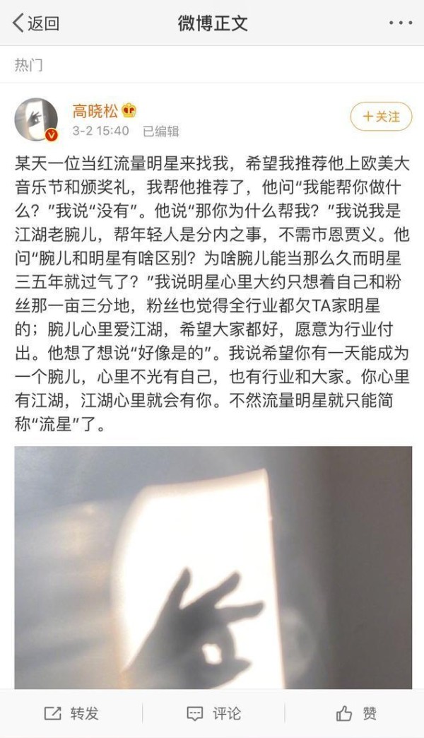 他发文讲述了一段提携后辈的故事,表示自己曾经推荐了一位当红流量明星登上欧美音乐节和颁奖礼,并且为这位后辈讲述了“腕儿和明星”的区别,让这位当红流量明星感到恍然大悟。