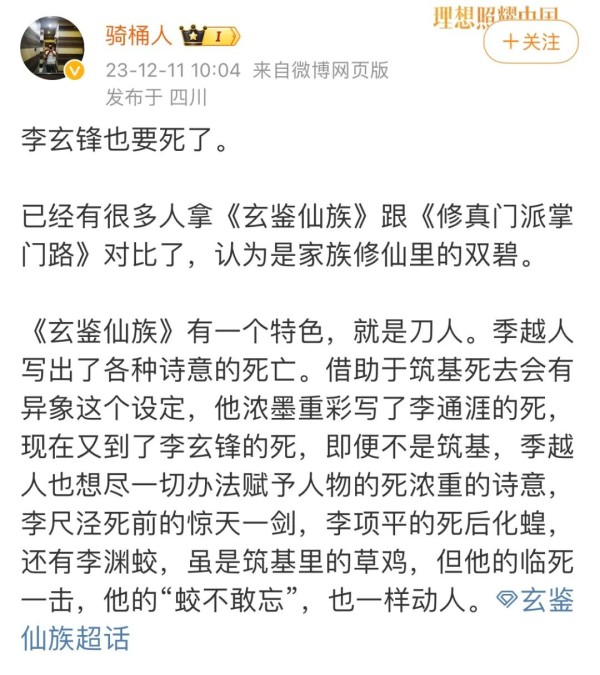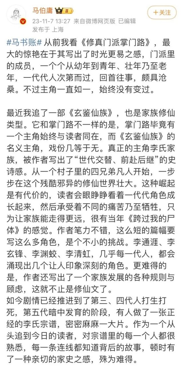“修仙是假,人情世故是真,想不有趣都难”“群像描写出彩,小人物的细节也到位,都有自己的人物高光”“剧情精彩,充满悬念,处处让读者欲罢不能” “作者一直稳得住,没有因为火了就改变风格”……《玄鉴仙族》得到了众多读者的好评,还得到知名作家和大V的推荐。作家马伯庸就是从头追起的“书粉”,他点评道:“作者笔力不错,这么短的篇幅要写这么多角色,是个不小的挑战……作者还写出了一个家族发展的各种规则与顾虑,这就不只是修仙文了。”