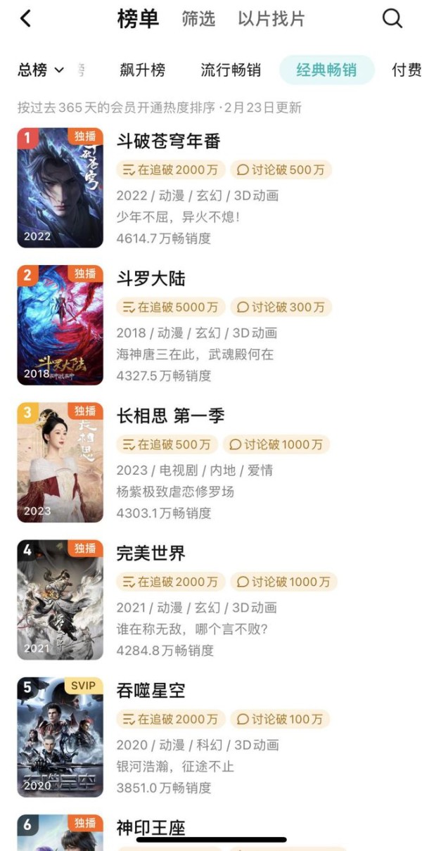 更重要的是,网文收入不止于阅读本身,IP改编也是大头。2023在更国漫内容集均有效播放霸屏榜,80%改编自网文而且来自阅文。腾讯的经典畅销榜单里,《斗破苍穹》年番位列第一,去年的大热剧《长相思》仅排第三。现在前五中,四部都是动漫且都改编自阅文IP。再加上IP出海的强劲趋势,起点国际(海外门户)已经上线3800多部国内网文的翻译作品。可以说,起点是名副其实的网文平台“大佬”。