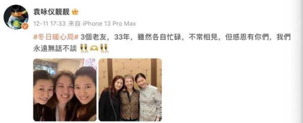 人都会变老,这不是什么大不了的事情,只是因为翁杏兰与姚康莉多年来甚少在香港露脸,大家几乎都只记得她们年轻时候的样貌,如今再见到才会不禁地感慨。不过在袁咏仪心中,姐妹就是姐妹,就算老了,也是大家一起老去,所以根本不需要介意。翁杏兰的确已经很久没有返回香港(在娱乐圈绝迹了30年),所以每一次回来,她都会约上袁咏仪等老友相聚,而大家上一次见面,恐怕也是在疫情之前了吧。