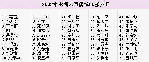 亚洲人气偶像50强出炉“亚洲人气偶像50强”出炉(附一览表)