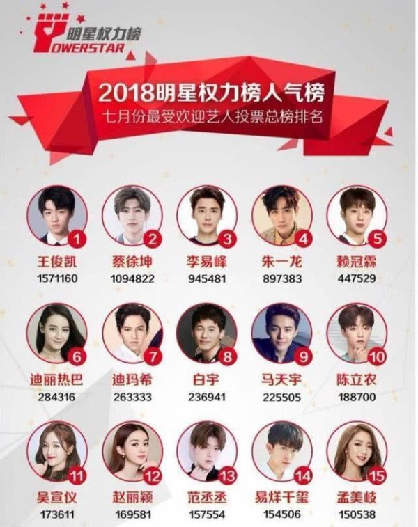 7月份明星人气榜:蔡徐坤第2、朱一龙第4、陈立农第10、第一意料