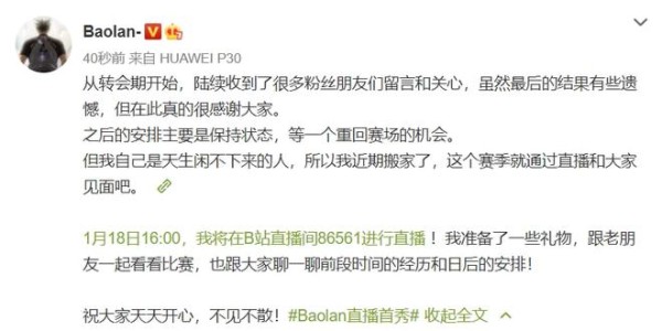 宝蓝的发文如下图所示,先是向粉丝们交代了一下自己的计划,表示自己对于转会期的结果很遗憾,后面的计划是暂时保持状态,等待一个重返赛场的机会。然后讲了关键信息,自己将在B站开播,和粉丝们聊聊天看看比赛。