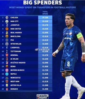转会市场》统计了历史转会费支出情况,切尔西独自领跑,前11名中英超独占6席。