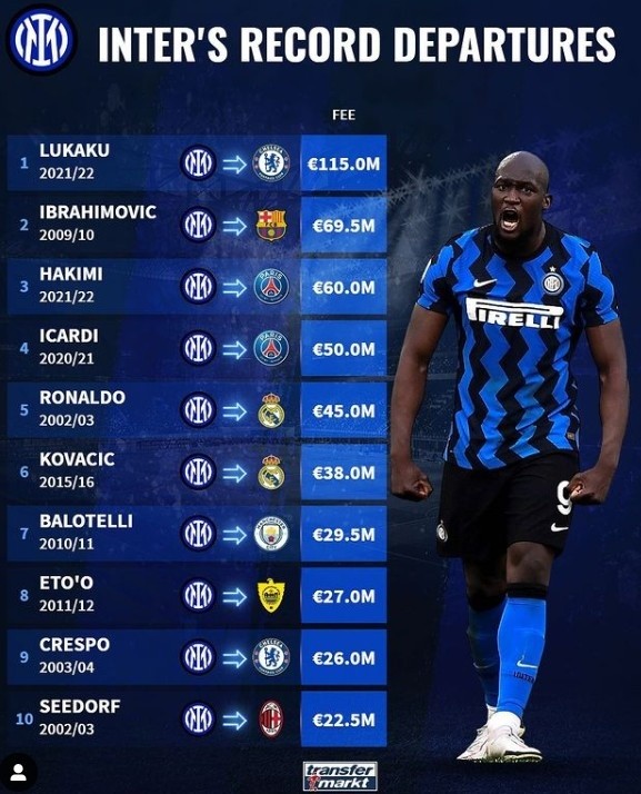 直播吧8月13日讯 切尔西官方宣布卢卡库回归,而国米也得以收获了创纪录的1.15亿欧元转会费收入。《转会市场》便统计了国米队史转出榜单。