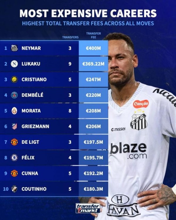 足坛球员累计转会费排行:内马尔C罗卢卡库前三,暴力鸟14
