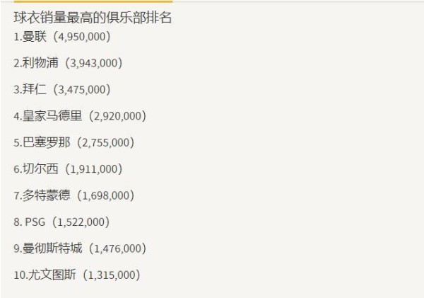 但除此之外,尤文图斯售出的超过100万件的球衣在球衣销量排名中排名欧洲第10位!(是唯一进入前十名的意大利俱乐部),而在这份球衣销量的榜单中。曼联处于领先位置领先,他们售出了近500万件球衣,其次是利物浦,近400万件和拜仁慕尼黑,有350万件。排在第四位的是皇马,有292万,排名第五的是巴塞罗那,有275万。