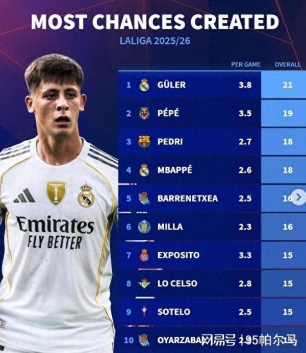 新赛季场均创造3.8次机会的居勒尔自然收割流量和缔造纪录,事实上在新赛季开打之前,土耳其新星的身价“只有”4500万欧元,然而在7轮西甲过后,完成大跃进的年轻人身价达到了6000万欧元。