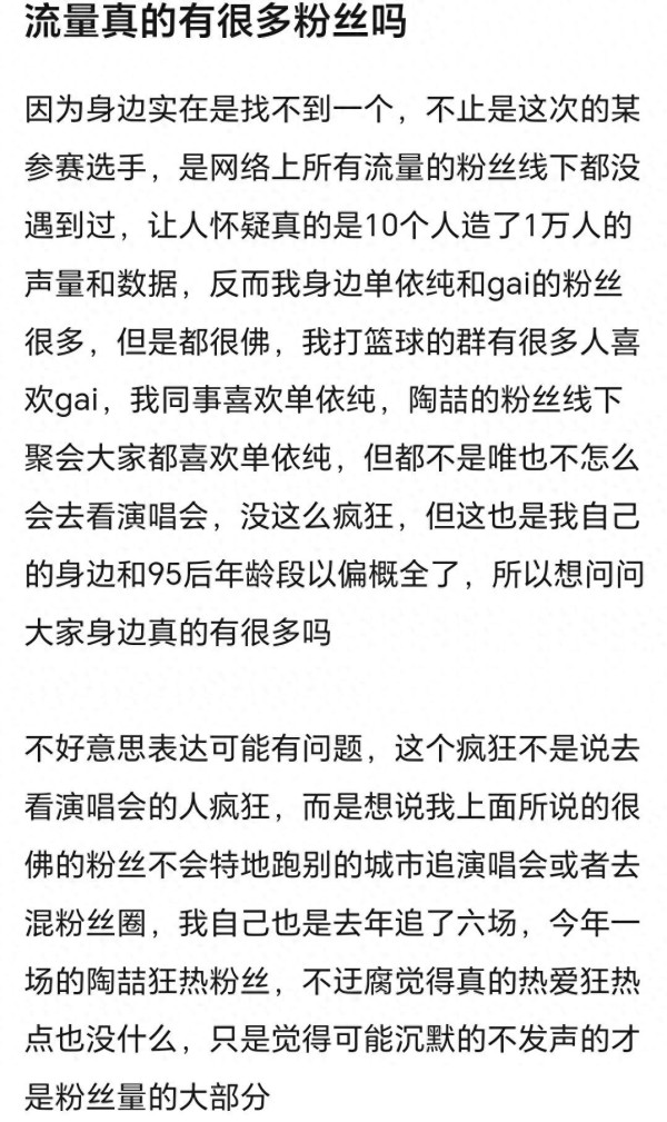 所以啊,别总觉得 "身边没有就等于不存在",你没看见的,不代表没发生。线上的声量是真的,线下的热爱也是真的,只是很多粉丝选择在属于自己的圈子里发光发热。下次再看到有人质疑 "流量有没有粉丝",不妨想想那些在演唱会现场哭红了眼的姑娘,想想那些熬夜做数据的粉丝群,想想那些默默买专辑支持偶像的普通人 —— 他们用自己的方式诠释着喜欢,这份喜欢,不该被偏见轻易否定。