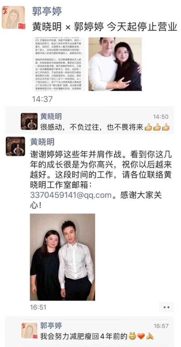 昨天是四月份的第一天,也是愚人节,娱乐圈中发生了不少的大事,比如金在中的“愚人”事件,鹿晗、吴亦凡新歌上线,还有黄晓明与自己的经纪人郭亭婷四年的合作也宣布结束了。据网友公开他们二人的朋友圈,黄晓明在朋友圈晒照官宣自己与经纪人的合作结束,并发文:“谢谢婷婷这些年并肩作战,看到你的这几年的成长很是为你高兴,祝你以后越来越好”,并附上自己工作室邮箱,工作通过邮箱联系。前经纪人也发文称:并不是愚人节玩笑,选择在今天公开,也是特意选的日子,并配图发了一份自己这几年与黄晓明共同工作的生活感想。