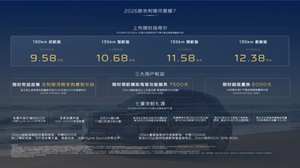11月19日,2026款吉利银河星舰7 EM-i正式登陆市场,以四大版型、五项核心升级和十大越级配置,重新定义了10万级电混SUV的价值标准。这款基于GEA全球新能源专属架构打造的力作,不仅延续了吉利银河系列"科技普惠"的基因,更通过电池、续航、智能、安全、舒适五大维度的全面突破,展现出对用户深层需求的精准洞察。