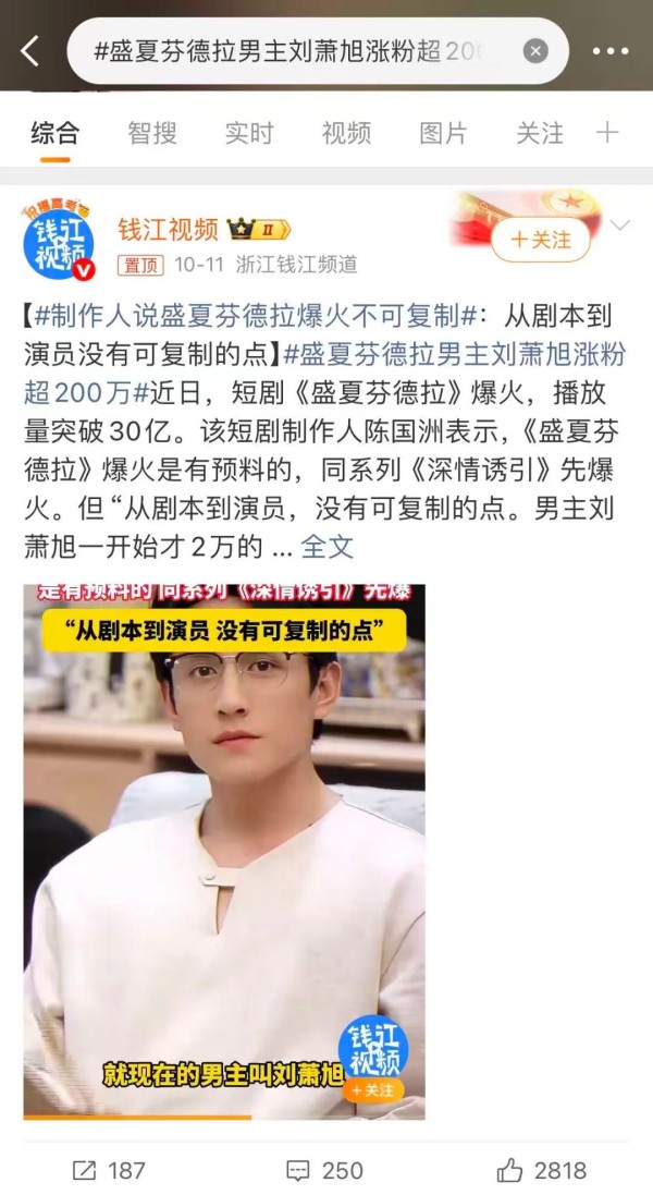 9月20日,短剧《盛夏芬德拉》闯入大众视野,上线首日实现热度值与播放量双破亿,连续三天打破平台最高热度纪录,上线半个月后突破30亿,成为短剧史上最快达成30亿播放量的作品,风头大到一度盖过赵露思、陈伟霆主演的长剧《许我耀眼》。