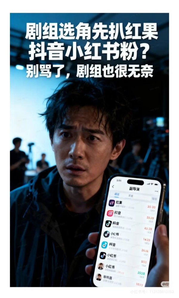 一位小红书网友爆料了剧组的选角场景——现在剧组选角有多魔幻?副导演扒着手机的架势比导演看剧本还专注:“A 演员红果 50.6 万粉、抖音 234 万、小红书 19 万;B 演员红果 2 万、抖音 36 万、小红书 1 万 —— 不用试戏,定 A!”