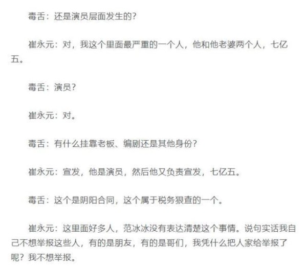 崔永元在采访中这样说:“这里面涉及到的是签阴阳合同,数目都吓死你”“他和他老婆两个人,七亿五”“宣发,他是演员,然后他又负责宣发,七亿五”。