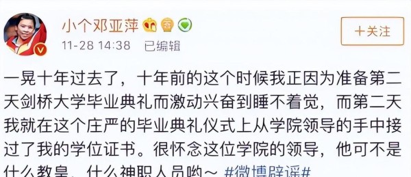 她2003年从剑桥大学毕业的时候,照片里她给老师下跪,当时就被一些人说成是崇洋媚外。其实这在剑桥就是一个传统仪式,每个人都得这么干。后来她解释了好多次,可网上还是有人骂个不停。这件事拖了好久好久才慢慢平息下来。