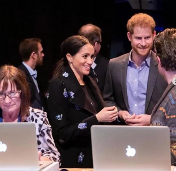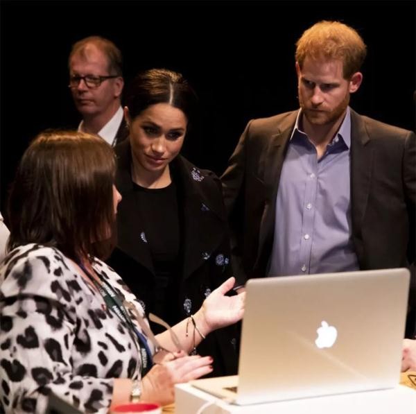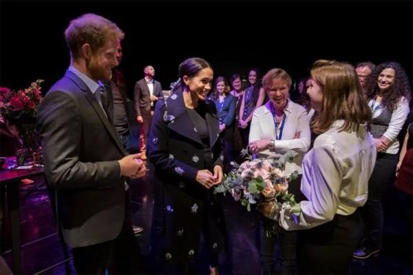 梅根受到了志愿者的热烈欢迎,人们为她送上粉色的鲜花,并搭配了时髦的尤加利叶,非常符合梅根·马克尔的潮人风格。梅根将头发直接扎在脑后,中分的设计修饰出脸型的精致感,她和哈里王子坐在一起时,架起了二郎腿,自信感由内而外的散发出来。