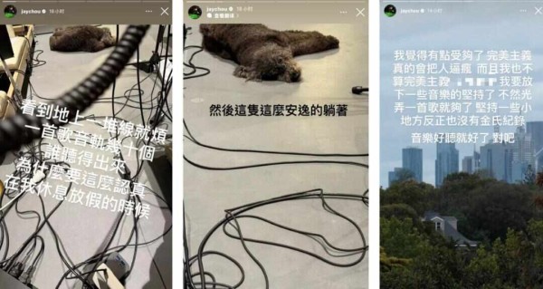 11月17日,据点时新闻,周杰伦在社交平台发文称被新歌“逼疯”:“看到地上一堆线就烦,一首歌音轨几十个谁听得出来,为什么要这么认真,在我休息放假的时候。”其还晒出小狗的照片,称:“然后这只这么安逸的躺着。”