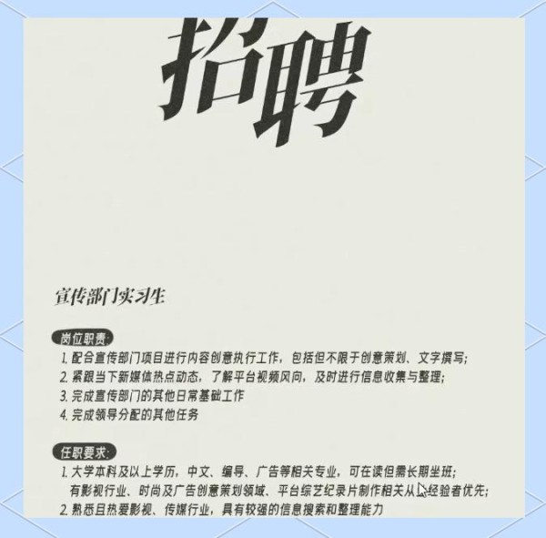 “明白乐”这个名字,一听就透露出一种独特的“小白”气息。网友们戏言,加入“明白乐”就能明白快乐的真谛!目前,我们正招聘宣传、平面设计及财务实习生,无论你感兴趣的是哪一个岗位,都有机会与小白成为同事。艺人工作室与经纪公司,向来是粉丝们心中的梦想之地。如今,我们为大家带来了最新的明星艺人经纪与传媒公司招聘信息,快来看看是否有你心仪的岗位吧!其中,哇唧唧哇这家公司尤为引人注目。作为综艺节目的重度用户,你是否也热爱着综艺节目?那么,此次的实习招聘机会你绝对不容错过。
