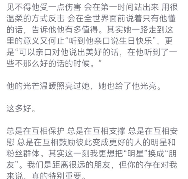 有一位粉丝深情地描绘了王俊凯与粉丝之间的羁绊:“我们彼此守护,相互扶持,共同成长。在相互鼓励中,我们努力成为更优秀的自己。这样的明星与粉丝关系,更像是一群志同道合的朋友。虽然相隔遥远,但你的存在对我来说意义非凡。”