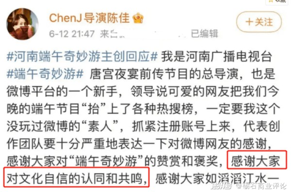 今年《唐宫夜宴》登上河南卫视春晚舞台后,短短三天时间,在抖音上的播放量高达4亿多次,并且很快冲上微博热搜榜第二位;播出五天之后,河南春晚的相关话题阅读、视频观看量超27亿次。这次“端午奇妙夜”微博相关话题阅读量更是达到了35亿,48小时内热搜上榜19次,视频的播放量也超过了1亿。