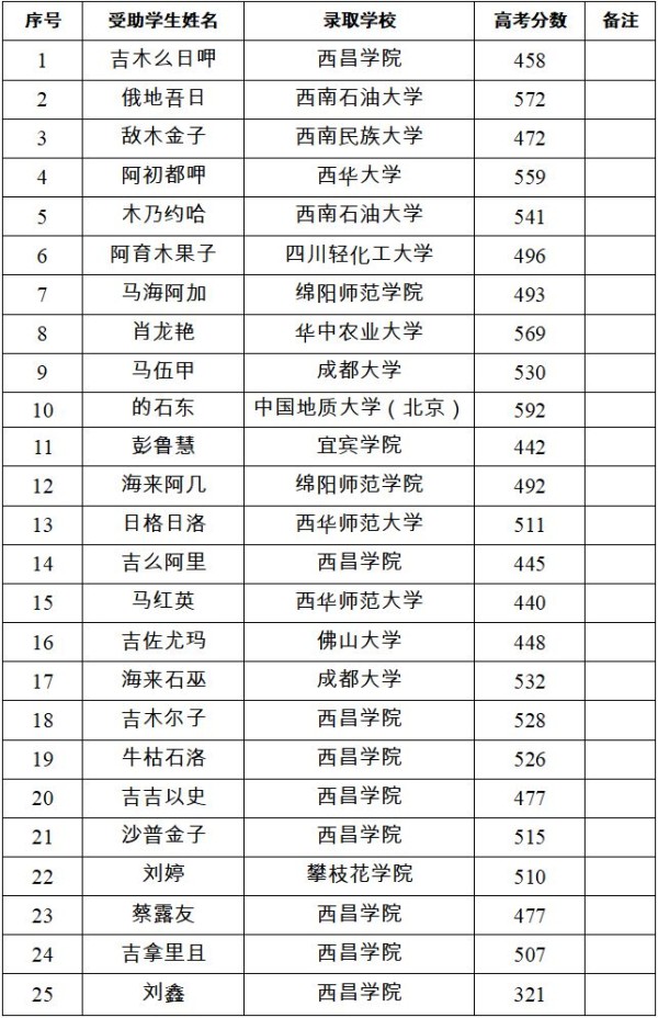 根据2025年“我要上大学”-“四川银行业慈善基金”助学金公益项目受助学生资助标准和推选条件,通过学生本人自愿申请,经相关部门审核,确定25人受助。现将名单公示如下: