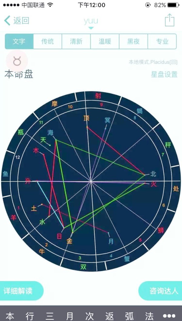 在深入探索星盘之前,让我们先了解一个占星学的小秘诀。星盘中的红色、绿色、蓝色和紫色连线代表行星间的相位关系。这些连线不仅揭示了行星间的角度,还影响着它们的能量互动。从物理学的角度来看,这些角度决定了行星能量如何产生作用力,既有积极也有消极,还有复杂而微妙的。其中,最佳的相位被称为“上帝的恩宠”,即120度角,也被称为拱相。这个相位犹如桥梁的弓形,象征着支撑与连接,因此被视为最吉祥的相位。