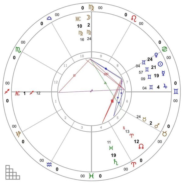 倘若三个同元素的星座相继落在三个相关联的行星上,它们将共同构成一个完美的三角形,即大三角,且每两颗星之间恰好呈现120度的拱相。然而,图中所示的盘主,其金星稍偏离了金牛座,进入双子座,从而破坏了大三角的完美形态。